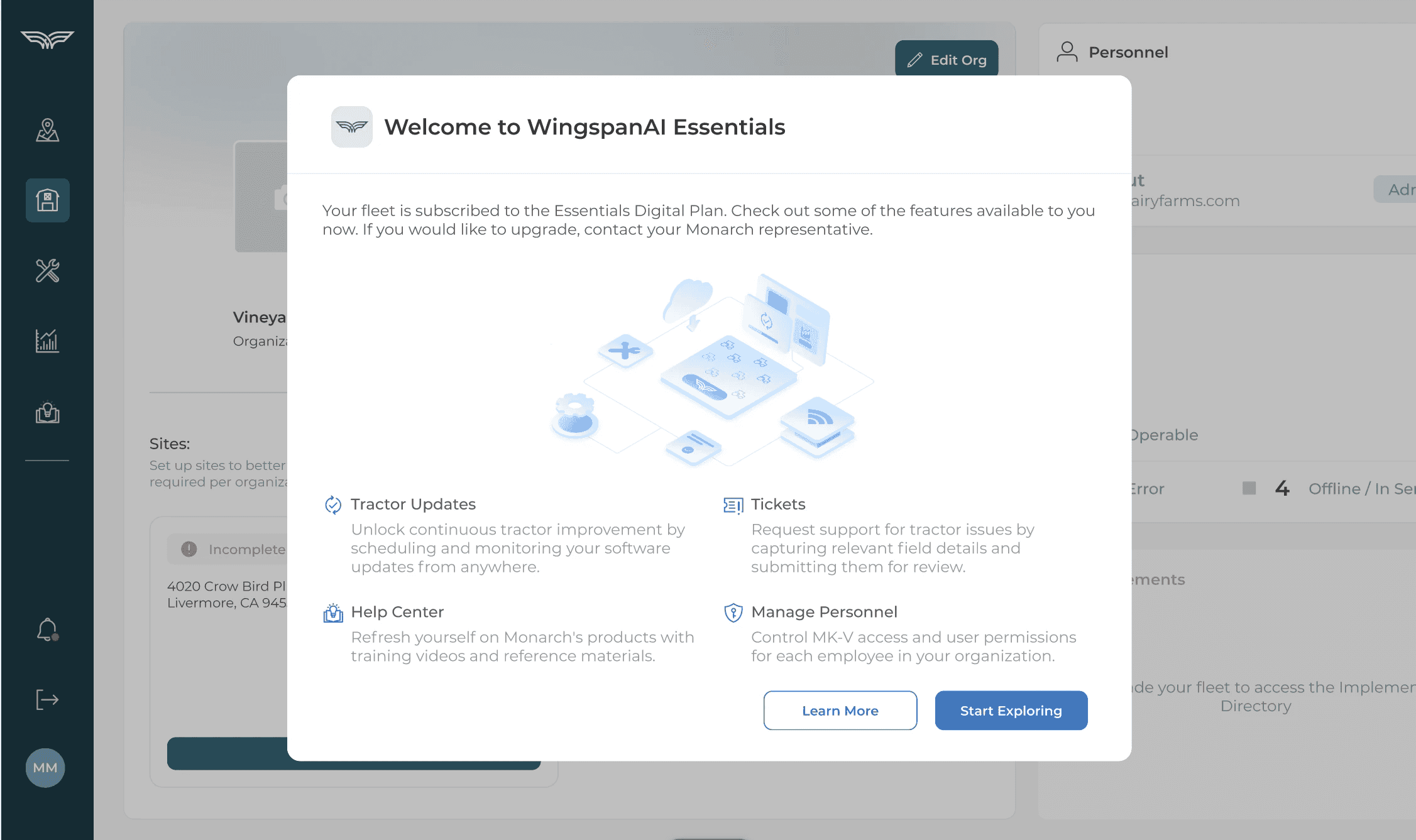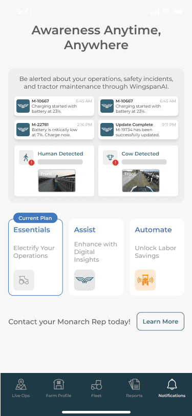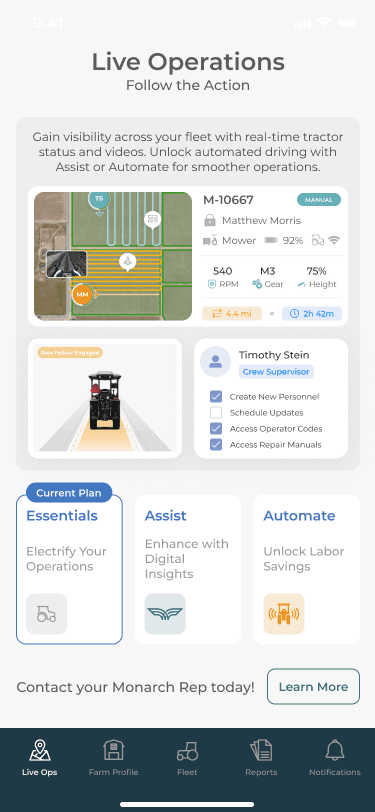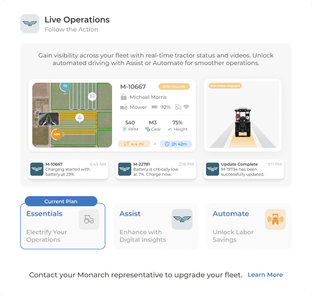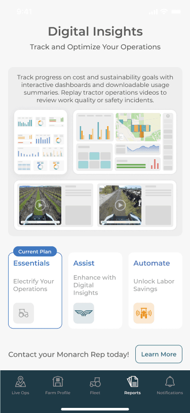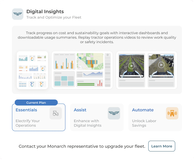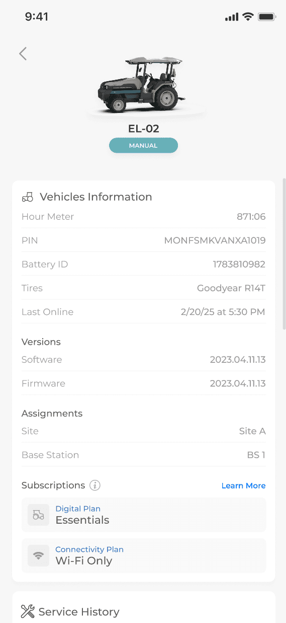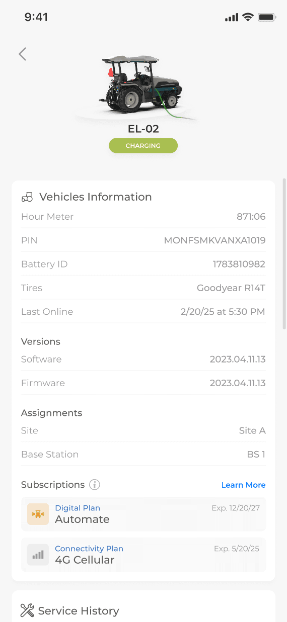 Subscription status is visible per vehicle, including expiration dates, so customers can confirm exactly what’s active on each tractor. This helped make the “included vs expired” shift concrete, especially for fleets managing multiple vehicles. From here, “Learn more” routes users into plan education and next steps.