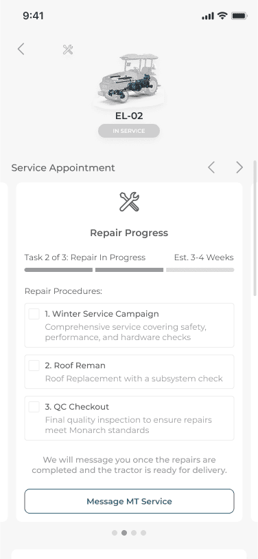 We believe that end-users want a smooth service appointment experience, with clear instructions for each part of the process, regular updates from the Monarch Support team, and a comprehensive record documenting all changes made to the tractor upon delivery.