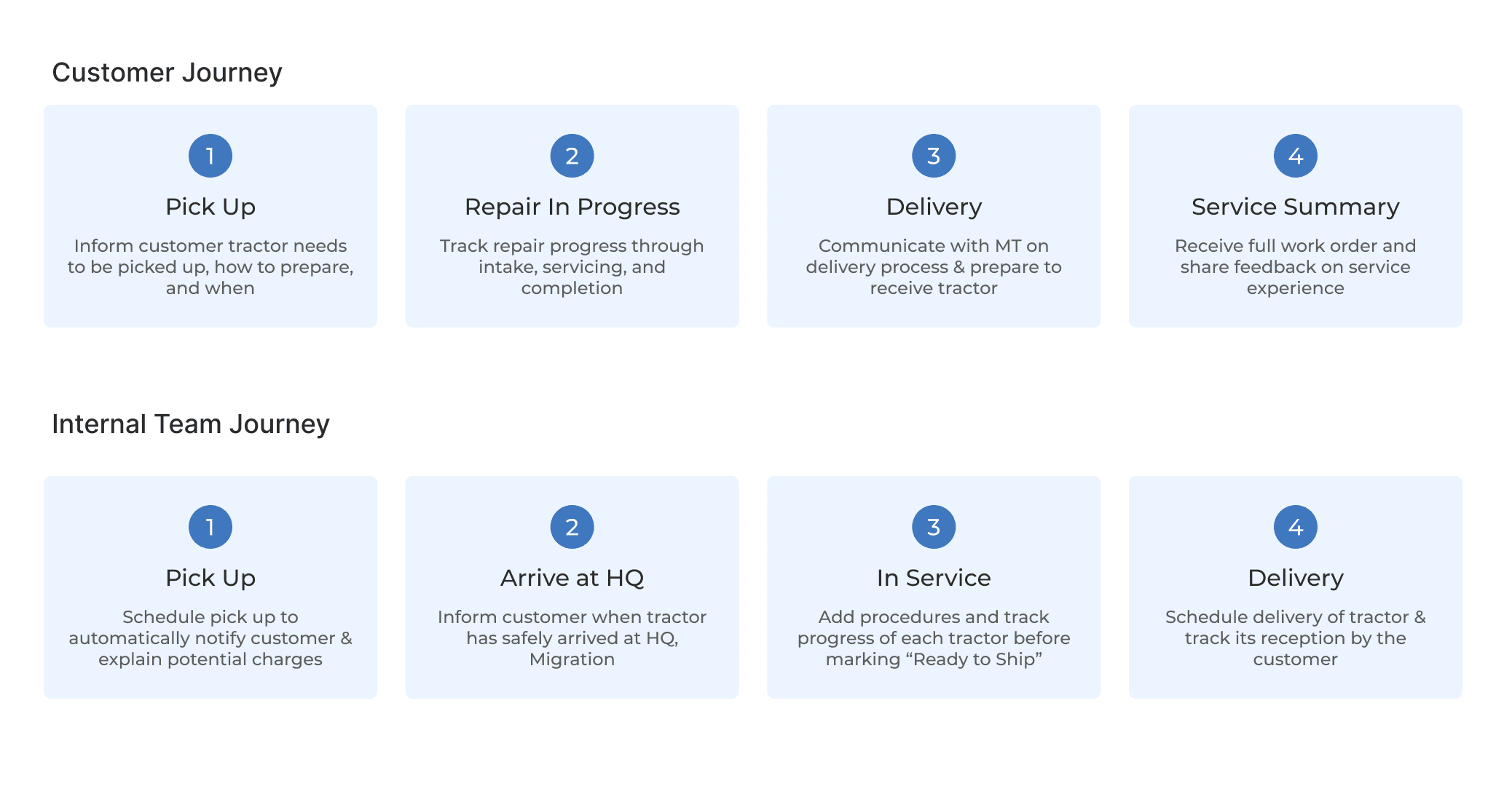 From that brainstorm, I began creating a joint user journey by using our internal management tool, called Nexus, as a central controller to guide tractors through the service process, while keeping end-users informed via WingspanAI. This trigger-based system ensured seamless updates across both platforms. To simplify workflows, I distilled the service journey into four key steps: Pick Up, Repair Progress, Delivery, and Service Summary.
