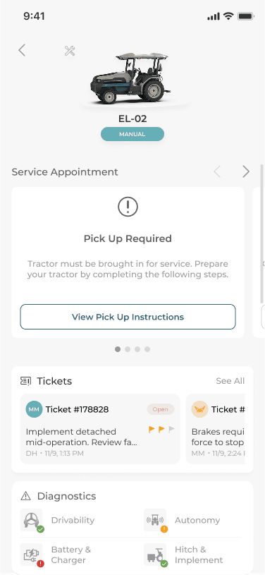 Nexus Web makes it easy for our internal team to track, diagnose, and manage repairs with minimal training. Each tractor has a digitized service history, complete with previews and downloadable work orders. Every button our team clicks triggers user-facing updates, so customers stay informed automatically without the need for manual outreach. The internal team controls the entire experience, ensuring users always know what’s happening with their tractor.